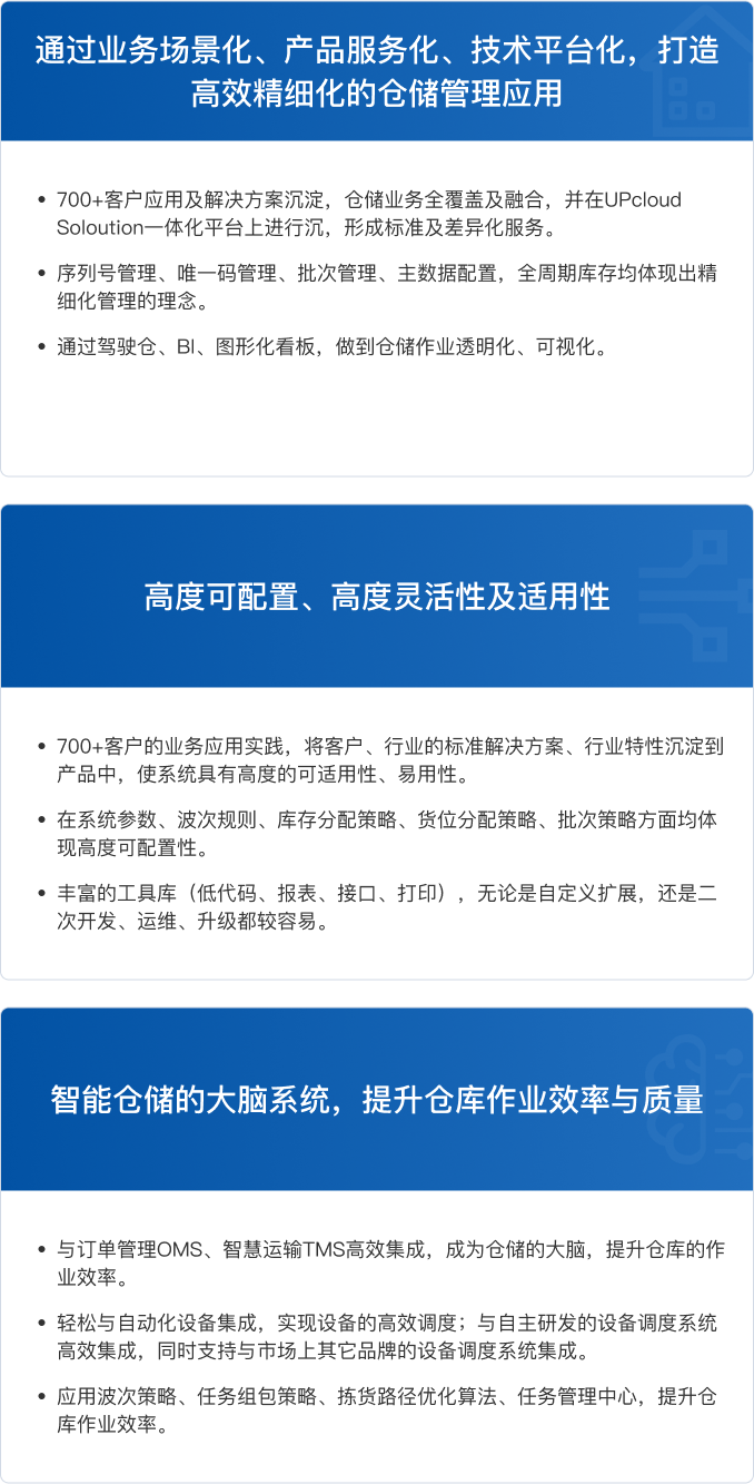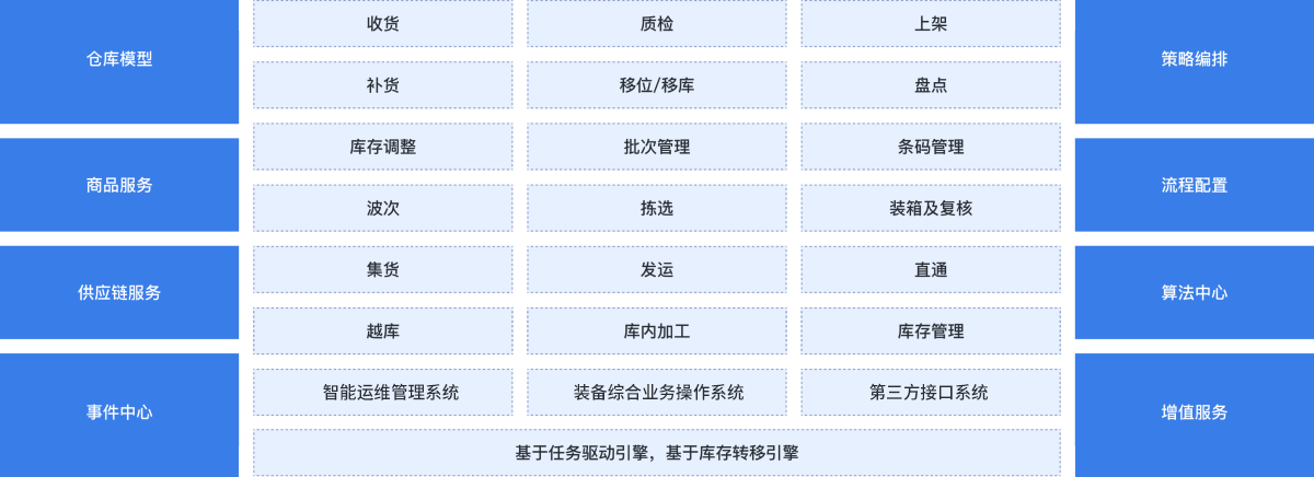 智慧倉儲WMS是倉庫管理的大腦,主要是面向入庫業(yè)務(wù)管理(收貨,質(zhì)檢,上架),出庫業(yè)務(wù)管理(波次,揀選,裝箱及復(fù)核,集貨),庫內(nèi)業(yè)務(wù)管理(補貨,移位/移庫,盤點,庫存狀態(tài)變化管理,庫存調(diào)整,批次管理),增值業(yè)務(wù)(庫內(nèi)加工,貨主轉(zhuǎn)換,商品追溯、條碼管理、智能運維管理系統(tǒng)、裝備綜合業(yè)務(wù)操作系統(tǒng)),主數(shù)據(jù)管理,產(chǎn)品集成供應(yīng)鏈行業(yè)具體應(yīng)用場景的算法服務(wù),可進一步提升業(yè)務(wù)執(zhí)行效率,助力企業(yè)數(shù)智化升級。